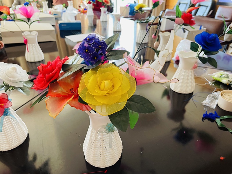 女神們一個(gè)個(gè)臉上洋溢著燦爛的笑容,手里忙活著自己的材料:絲網(wǎng)、鐵絲、花桿、花葉、尖嘴鉗、剪刀……正在大家不知所措的時(shí)候,幸好有我們熱情的鐘敏亞“鐘老師”為我們講解了制作過程:1、套筒:將鐵絲繞模具成一個(gè)圈,尾端留出1厘米,用鉗子將鐵絲尾端攪在一起。2、將絲網(wǎng)裹在鐵圈,形成一個(gè)個(gè)大小不同的花瓣。3、將花瓣一片一片地綁上去。4、花瓣綁緊后,花的樣子就定下來了。5、稍作修飾,放上花葉,把花瓣用手輕輕按壓,一朵栩栩如生的花朵就出來了??纯醋郎嫌胁煌伾拿倒寤?、百合花……都是由各位女神們巧手制作而成的。
